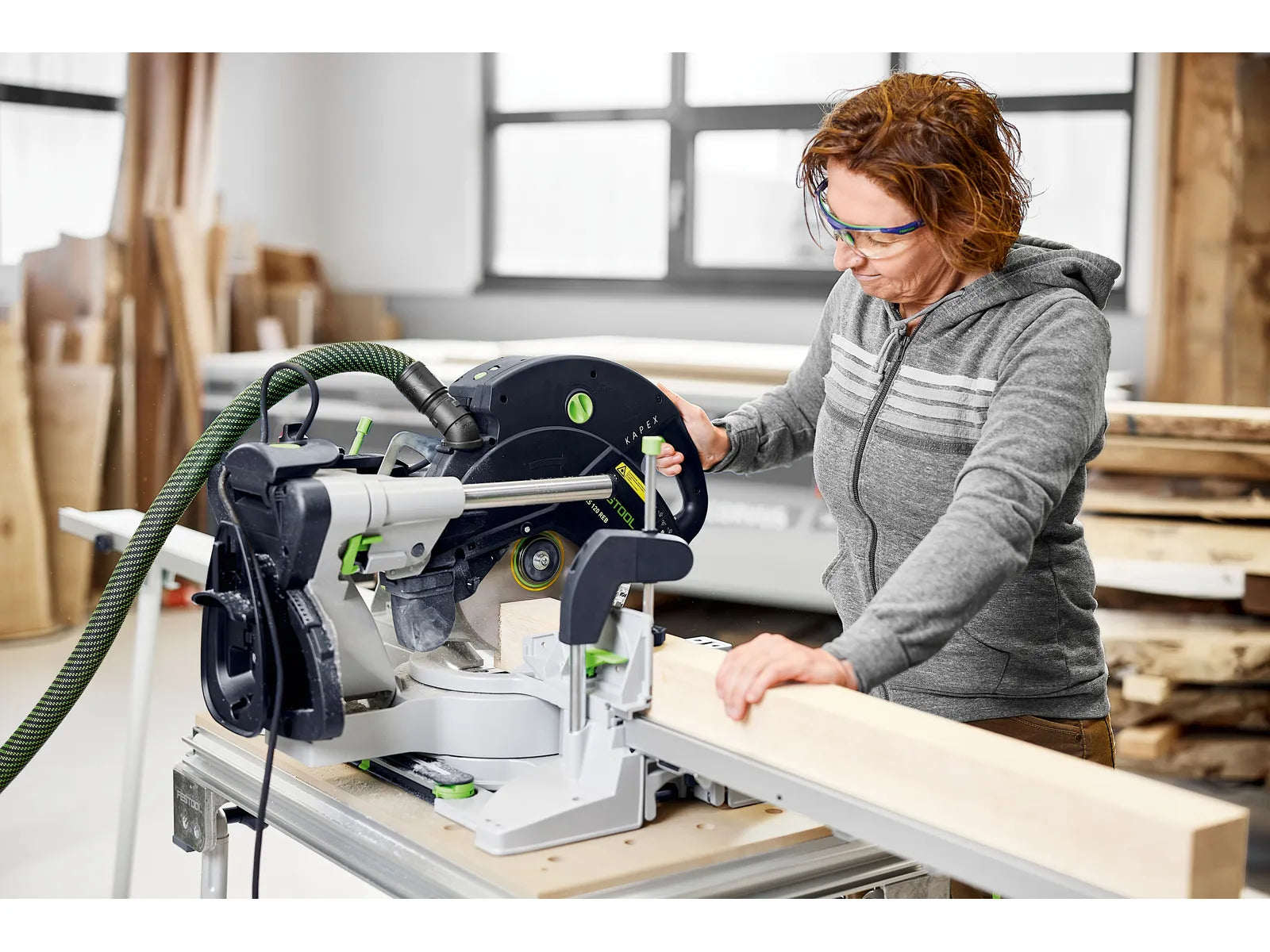 The Festool KS 120 REB KAPEX sliding compound mitre saw, available in REB-Set-UG, REB, and REB-Set-MFT configurations, brings precision to woodworking with a 1,600W motor and 260mm WOOD UNIVERSAL HW blade. Offering cutting depths up to 305 x 88mm at 90°/90°, this 24.3kg saw suits most 18V tools (excluding specific models), making it a top choice for professionals seeking a compound mitre saw Festool to buy in Germany.