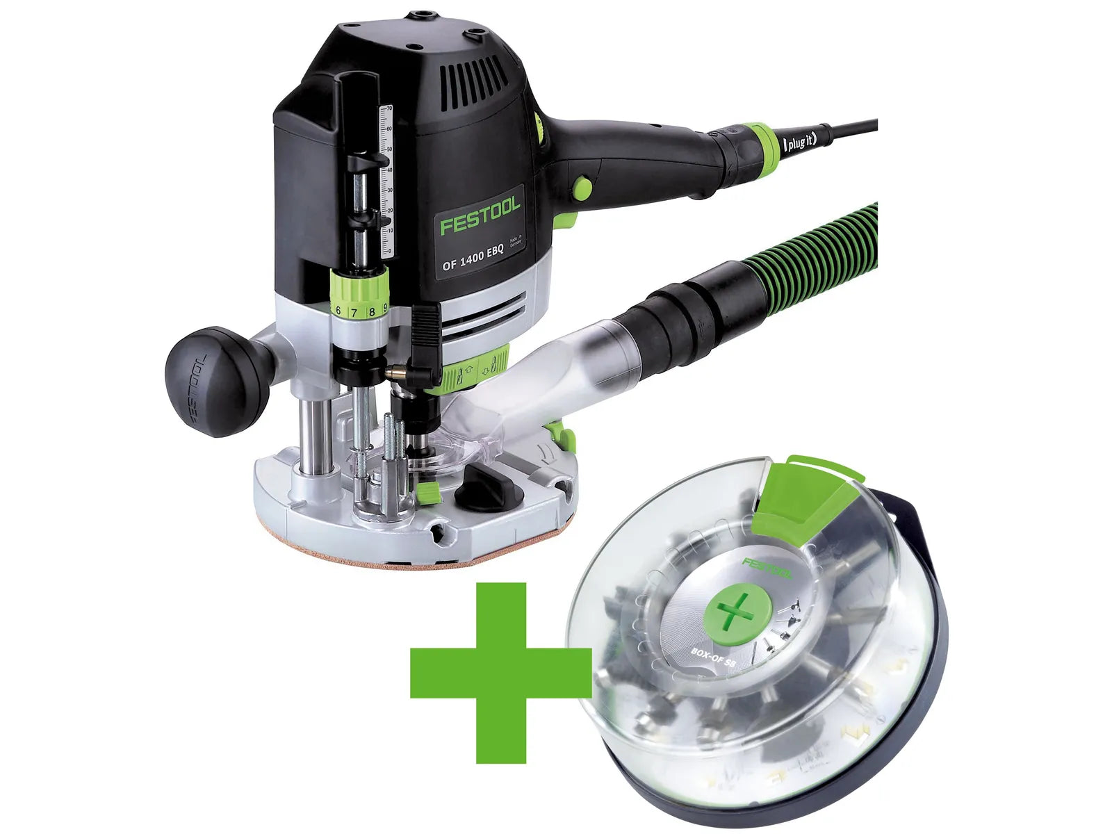 EBQ-Plus + Box-OF-S: Umfasst 10 Artikel – Spannzange SZ-D 8.0/OF 1400/2000/2200, Spannzange SZ-D 12.0/OF 1400/2000/2200, Parallelanschlag SA-OF 1400, Kopierring KR-D 30.0/OF 1400, Absaughaube, Späneabweiser KSF-OF 1400, Maulschlüssel WAF 24, Plug-it-Kabel H05 RN-F-4, Fräserbox Box-OF HW S8 Mix und SYS3 M 337 Systainer – für erweiterte Vielseitigkeit.