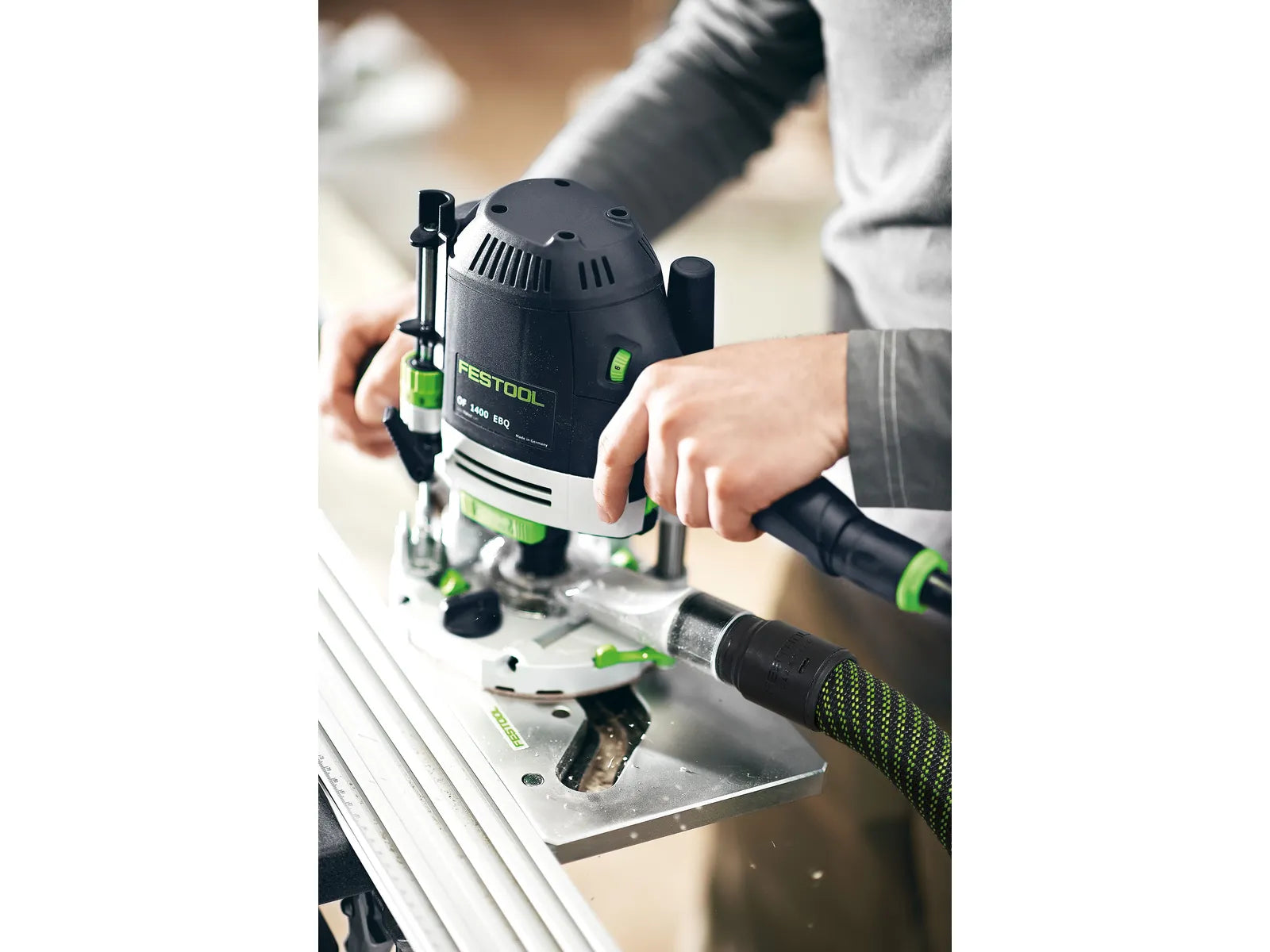 EBQ-Plus: Enthält 9 Artikel – Spannzange SZ-D 8.0/OF 1400/2000/2200, Spannzange SZ-D 12.0/OF 1400/2000/2200, Parallelanschlag SA-OF 1400, Kopierring KR-D 30.0/OF 1400, Absaughaube, Späneabweiser KSF-OF 1400, Maulschlüssel WAF 24, Steckkabel H05 RN-F-4 und SYS3 M 337 Systainer – für ein komplettes Frässystem.